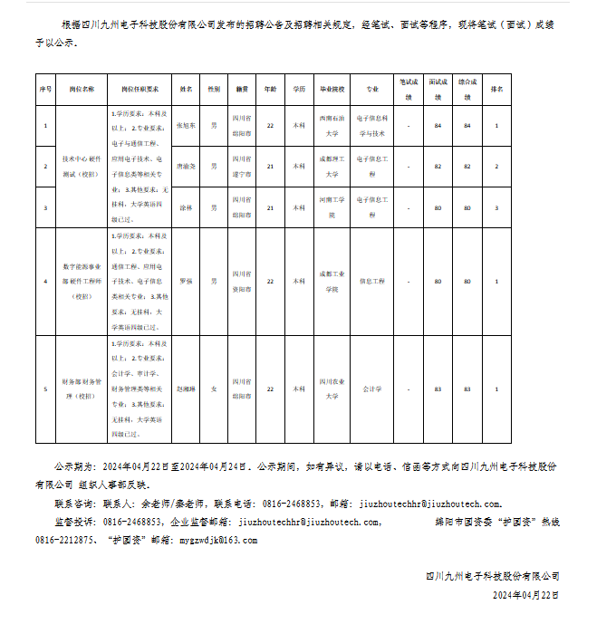 四川九州電子科技股份有限公司關于招聘財務管理(校招)等崗位測試成績的公示