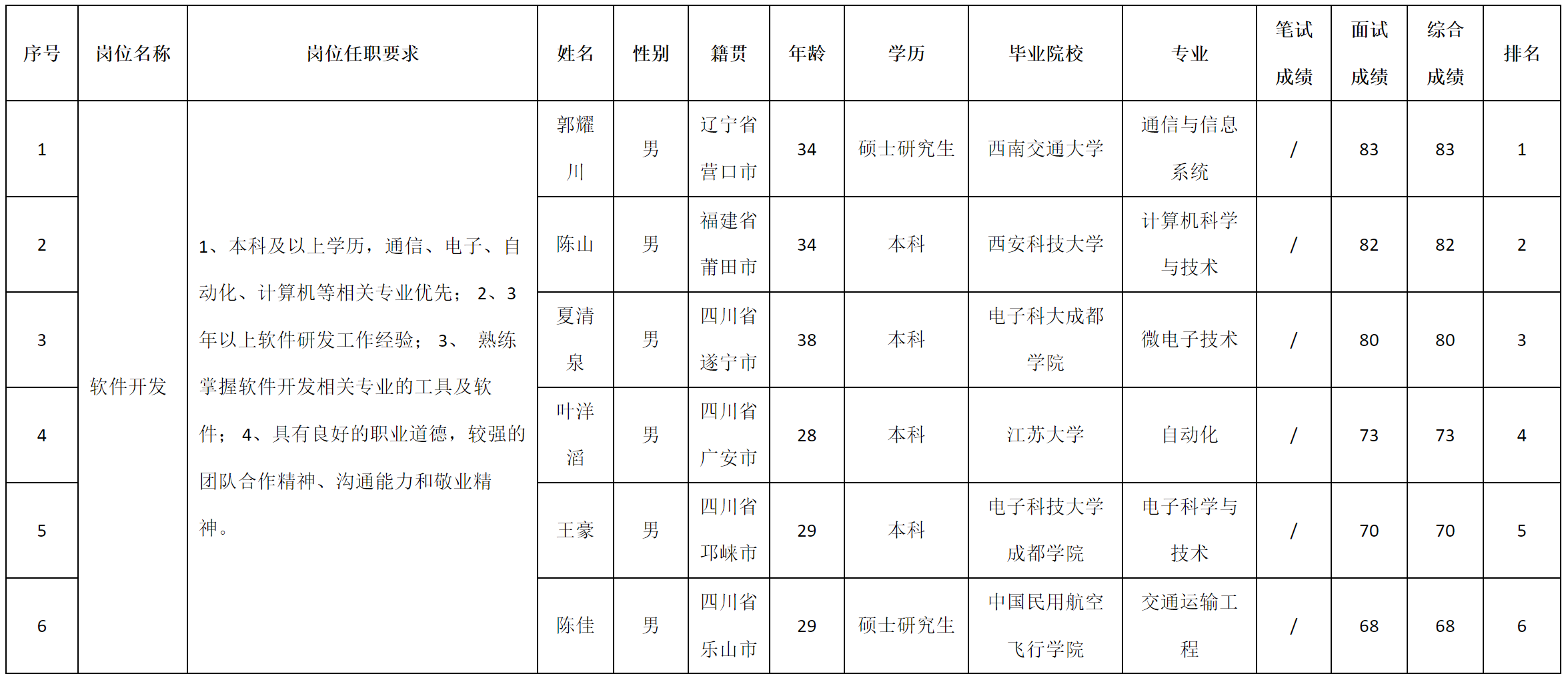 根據(jù)四川九州軟件有限公司發(fā)布的招聘公告及招聘相關(guān)規(guī)定,經(jīng)筆試、面試等程序,現(xiàn)將筆試(面試)成績(jī)予以公示。