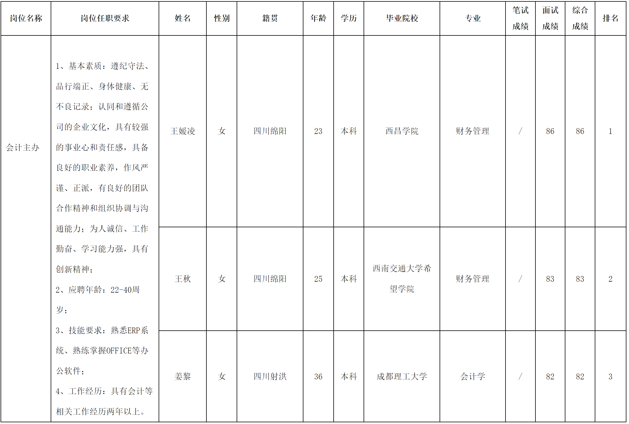 根據(jù)四川長(zhǎng)虹物業(yè)服務(wù)有限責(zé)任公司綿陽分公司發(fā)布的招聘公告及招聘相關(guān)規(guī)定,經(jīng)筆試、面試等程序,現(xiàn)將筆試(面試)成績(jī)予以公示。