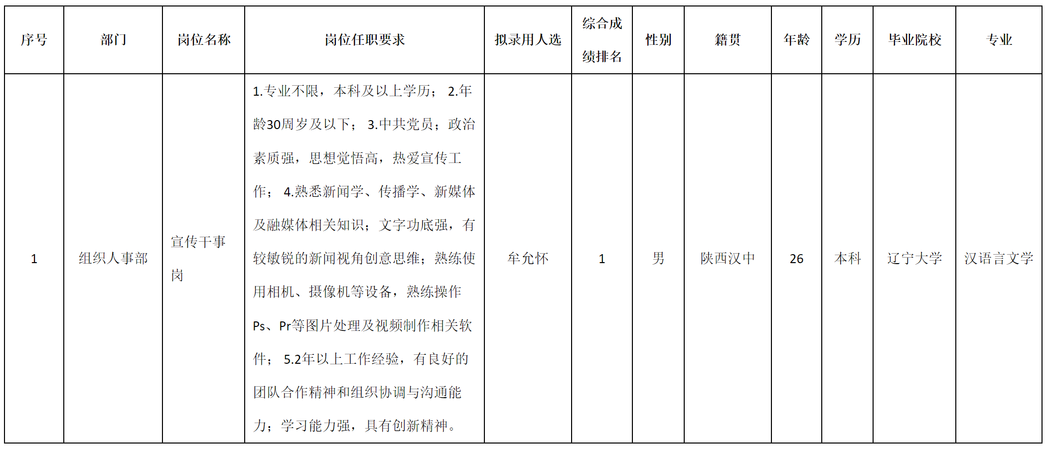 根據(jù)四川九州投資控股集團有限公司發(fā)布的招聘公告及招聘相關(guān)規(guī)定,經(jīng)筆試、面試、考察、體檢等程序,擬錄用牟允懷同志到四川九州投資控股集團有限公司工作,現(xiàn)予以公示,具體情況如下: