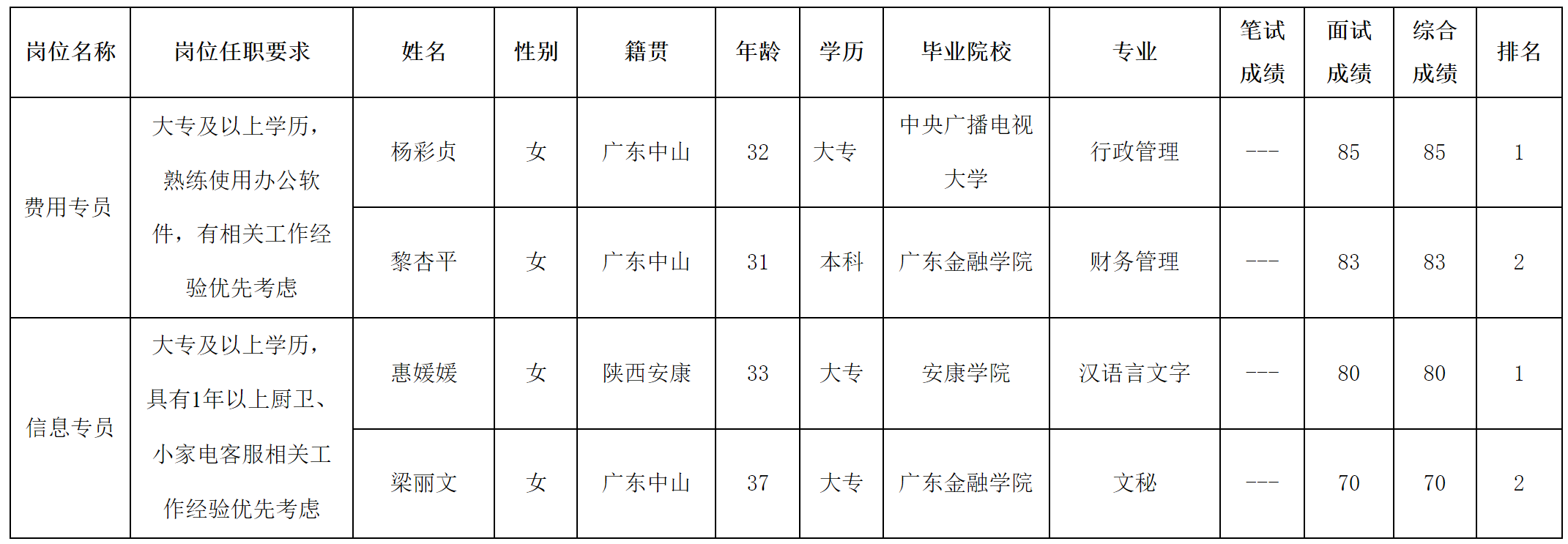 根據(jù)合肥長虹美菱生活電器有限公司發(fā)布的招聘公告及招聘相關(guān)規(guī)定,經(jīng)面試程序,現(xiàn)將筆試(面試)成績予以公示。