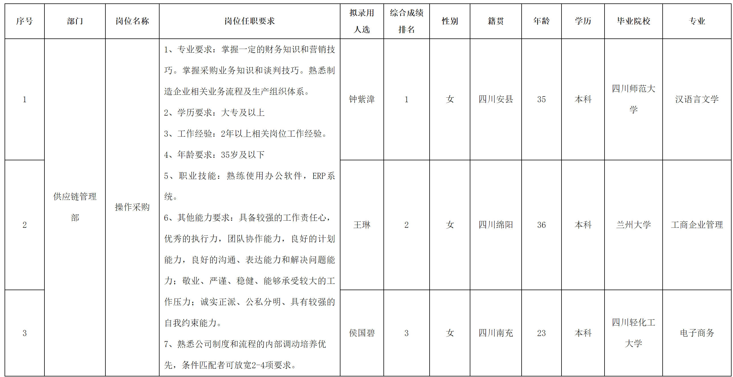 根據(jù)四川愛創(chuàng)科技有限公司發(fā)布的招聘公告及招聘相關(guān)規(guī)定,經(jīng)面試、考察、體檢等程序,擬錄用鐘紫湋、王琳、侯國碧到供應(yīng)鏈管理部工作,現(xiàn)予以公示,具體情況如下: