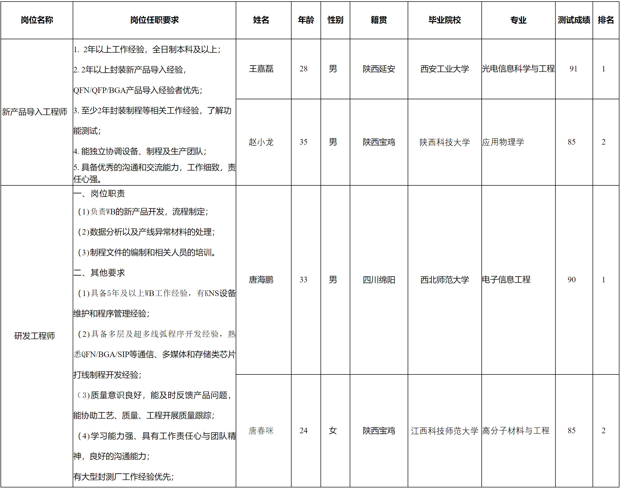 根據(jù)四川啟賽微電子有限公司發(fā)布的招聘公告及招聘相關(guān)規(guī)定,經(jīng)用人單位面試程序,現(xiàn)將測(cè)試合格人員予以公示。