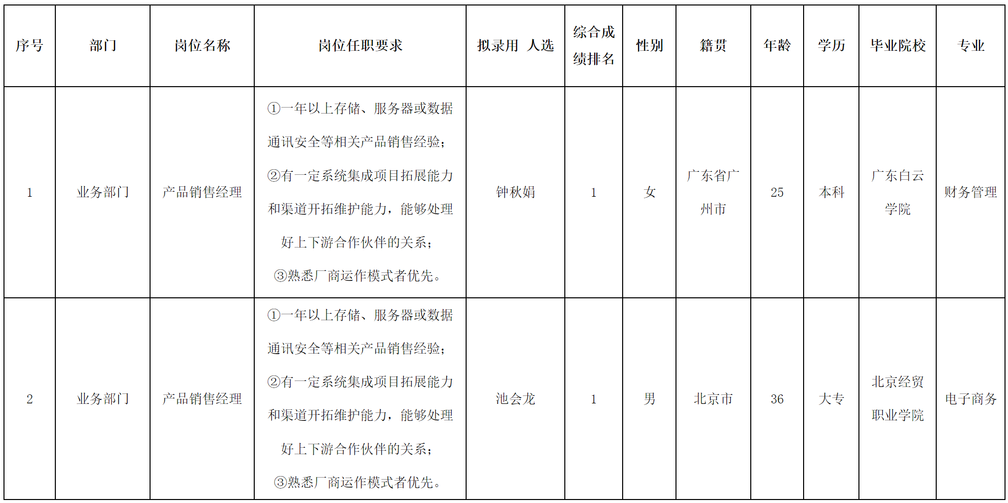 根據(jù)四川長(zhǎng)虹佳華信息產(chǎn)品有限責(zé)任公司發(fā)布的招聘公告及招聘相關(guān)規(guī)定,經(jīng)面試、考察、體檢等程序,擬錄用鐘秋娟、池會(huì)龍同志到四川長(zhǎng)虹佳華信息產(chǎn)品有限責(zé)任公司工作,現(xiàn)予以公示,具體情況如下