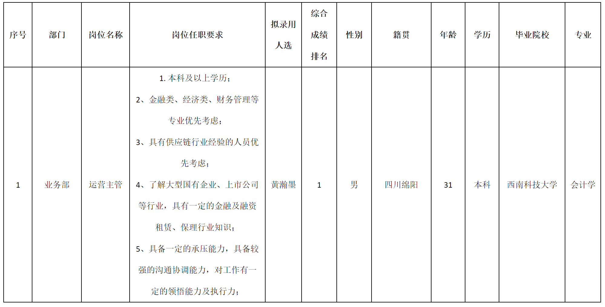 根據(jù)遠(yuǎn)信融資租賃有限公司發(fā)布的招聘公告及招聘相關(guān)規(guī)定,經(jīng)面試、考察、等程序,擬錄用黃瀚墨同志到遠(yuǎn)信租賃工作,現(xiàn)予以公示,具體情況如下: