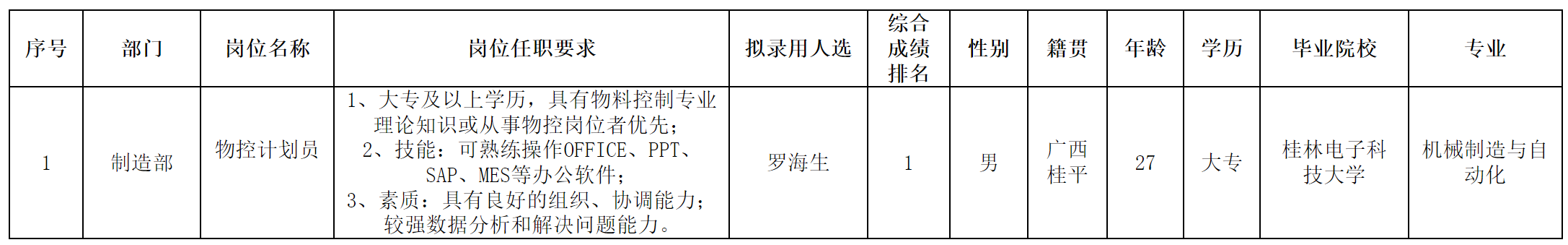 根據(jù)中山長虹電器有限公司發(fā)布的招聘公告及招聘相關(guān)規(guī)定,經(jīng)面試、考察、體檢等程序,擬錄用羅海生同志到物控計劃員崗位工作,現(xiàn)予以公示,具體情況如下:
