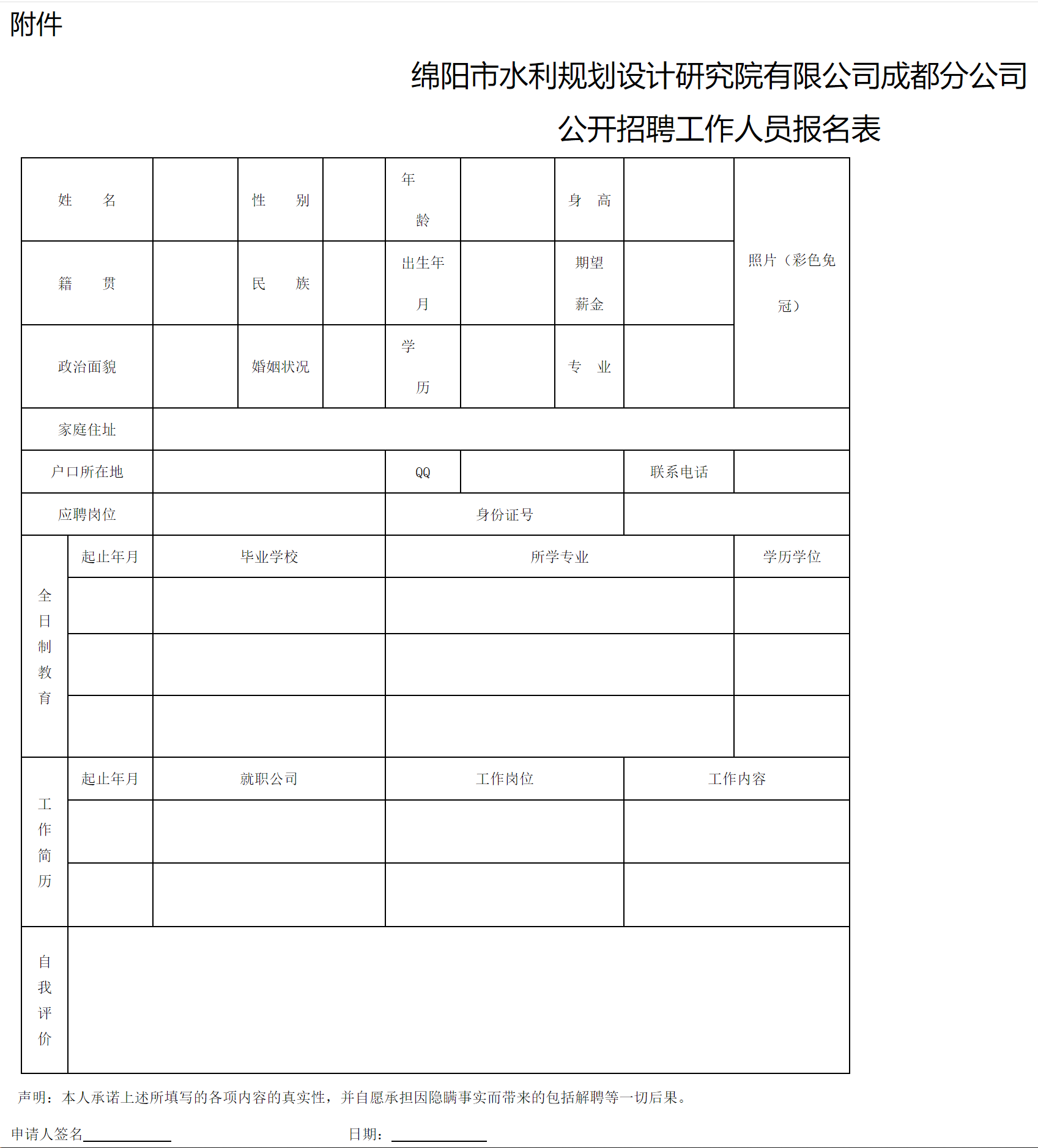 附件:綿陽市水利規(guī)劃設(shè)計(jì)研究院有限公司成都分公司公開招聘工作人員報(bào)名表