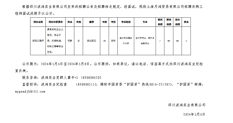 四川波鴻實業(yè)有限公司關(guān)于招聘上海月鴻貿(mào)易有限公司招聘采購工程師測試成績的公示