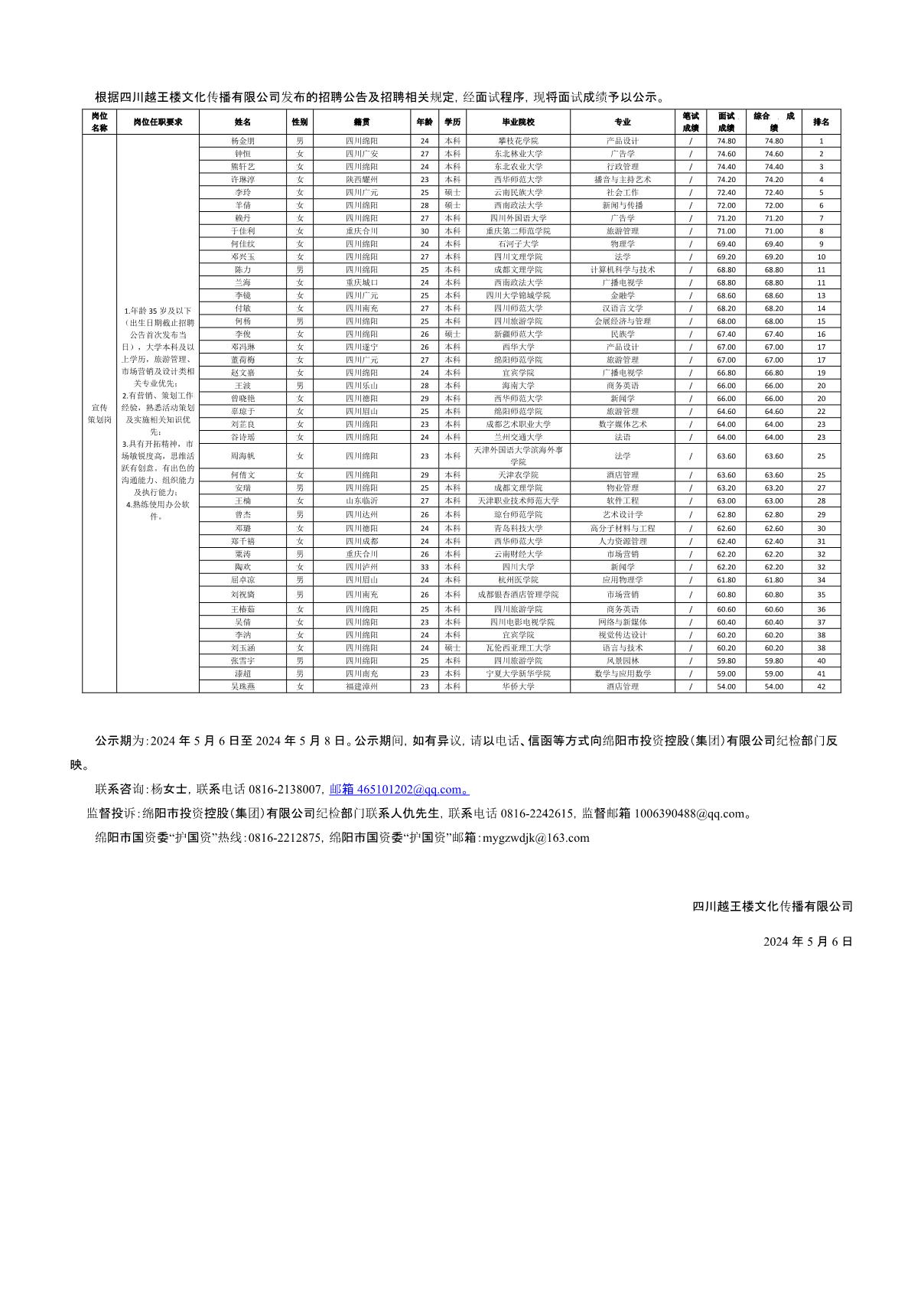 四川越王樓文化傳播有限公司關(guān)于招聘宣傳策劃崗位測(cè)試成績的公示