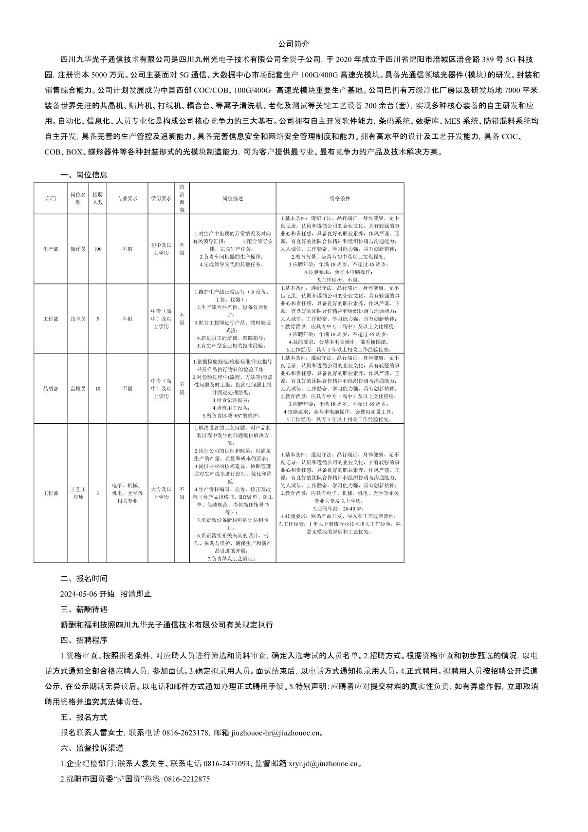 四川九華光子通信技術(shù)有限公司關(guān)于招聘操作員等崗位的公告