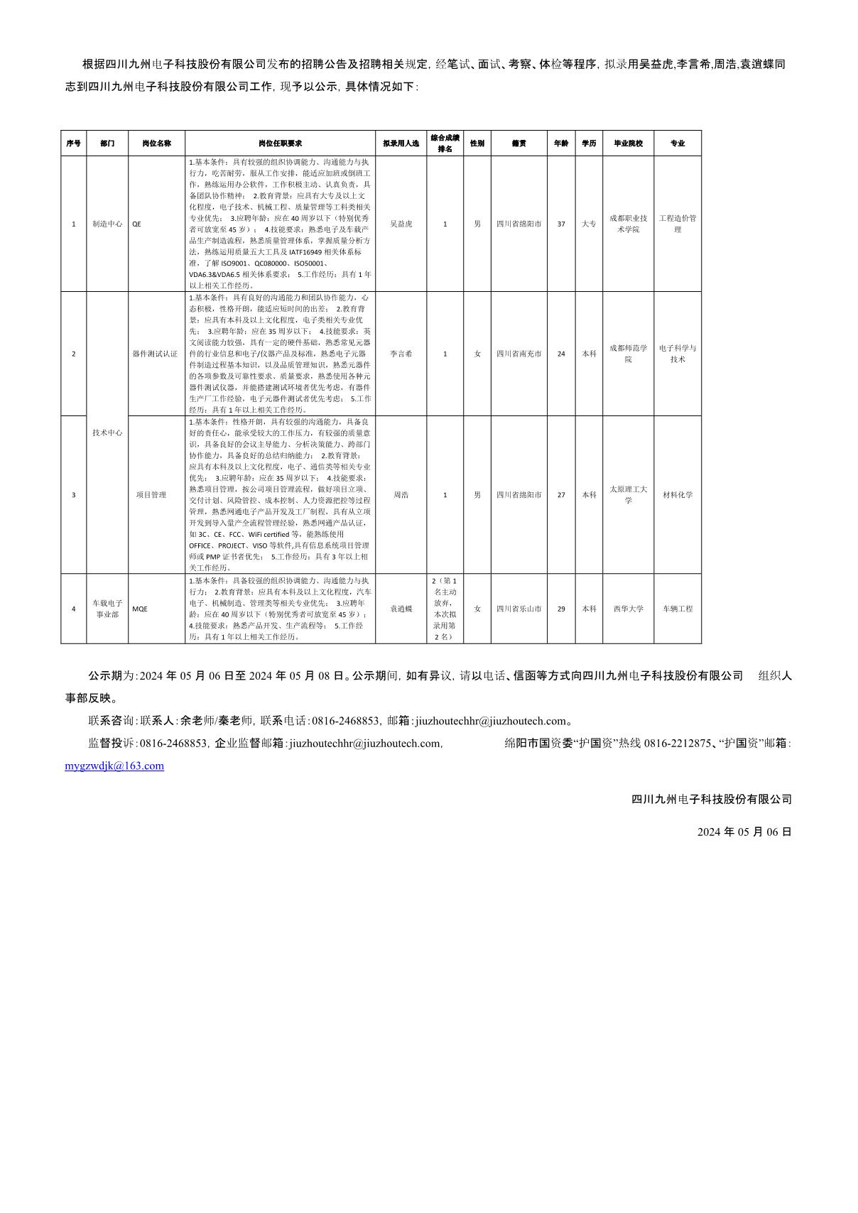 四川九州電子科技股份有限公司關(guān)于招聘QE等崗位擬錄用人員的公示
