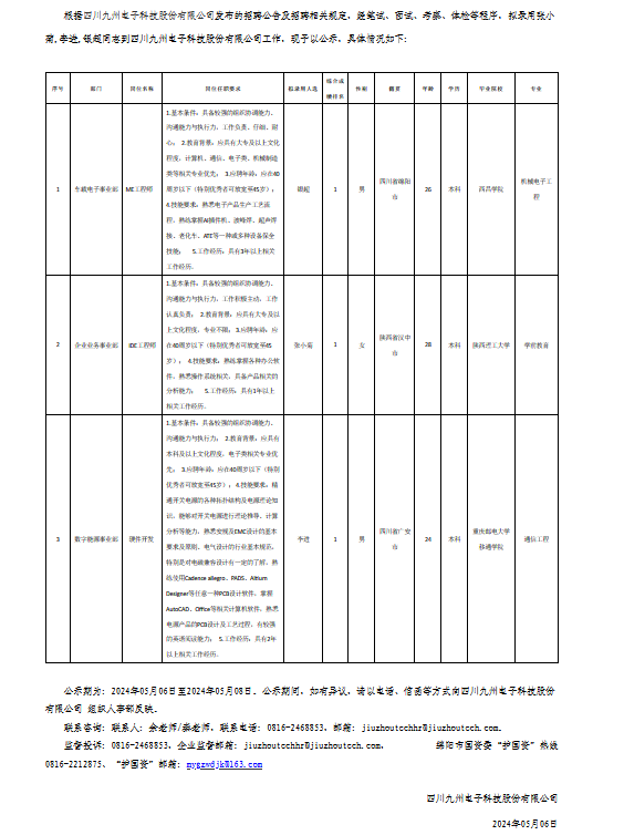 四川九州電子科技股份有限公司關(guān)于招聘 IDE工程師等崗位擬錄用人員的公示