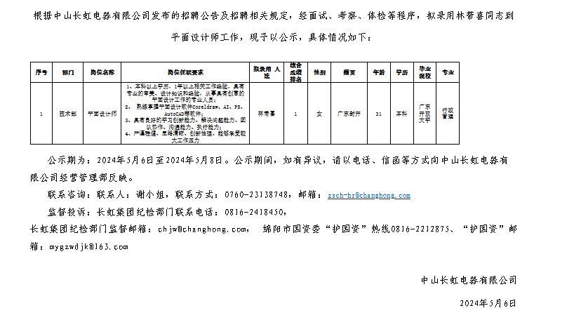 中山長(zhǎng)虹電器有限公司關(guān)于招聘平面設(shè)計(jì)師崗位擬錄用人員的公示