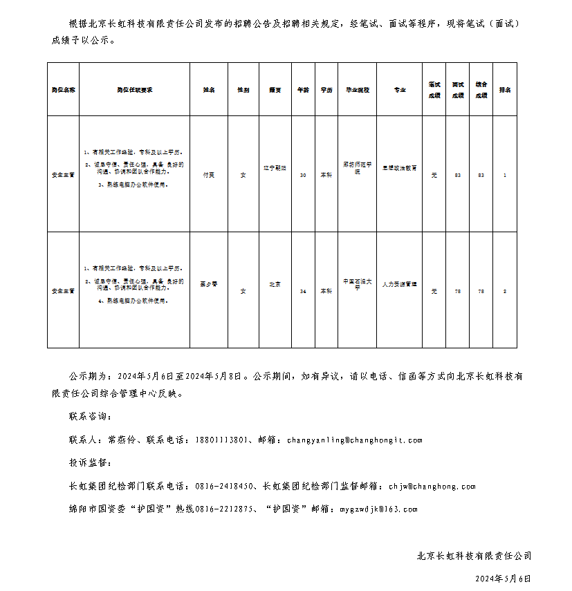 北京長(zhǎng)虹有限責(zé)任公司關(guān)于招聘安全主管測(cè)試成績(jī)的公示