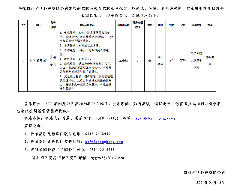 四川愛創(chuàng)科技有限公司關(guān)于招聘資金會計崗位擬錄用人員的公示