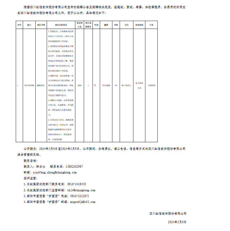 四川虹信軟件股份有限公司關(guān)于招聘戰(zhàn)略研究崗位擬錄用人員的公示
