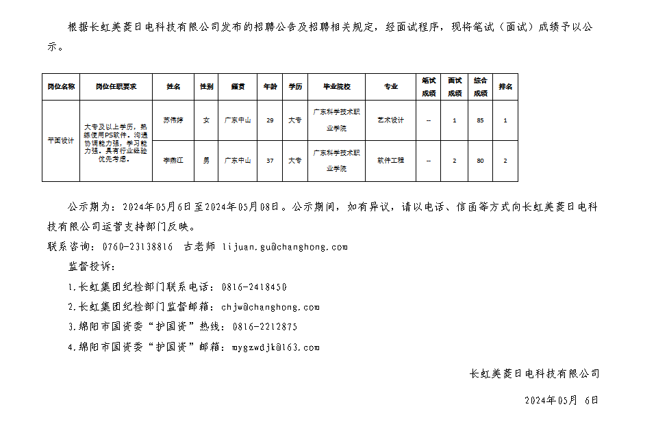 長(zhǎng)虹美菱日電科技有限公司關(guān)于招聘平面設(shè)計(jì)崗位測(cè)試成績(jī)的公示
