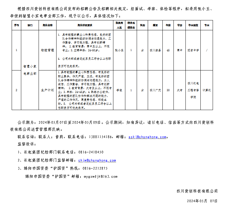 四川愛創(chuàng)科技有限公司關(guān)于招聘物控管理等崗位擬錄用人員的公示
