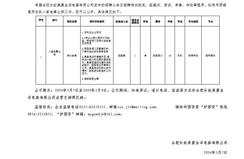 合肥長(zhǎng)虹美菱生活電器有限公司關(guān)于招聘培訓(xùn)經(jīng)理擬錄用人員的公示