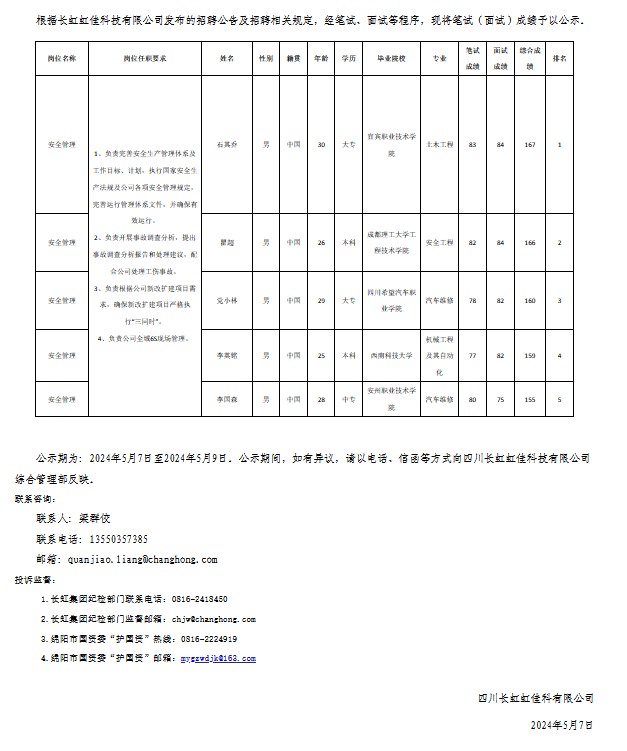 四川長虹虹佳科技有限公司關(guān)于招聘安全管理崗位測試成績的公示