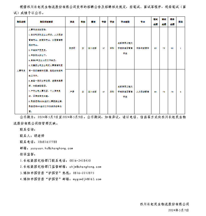 四川長虹民生物流股份有限公司關(guān)于招聘人事專員測試成績的公示