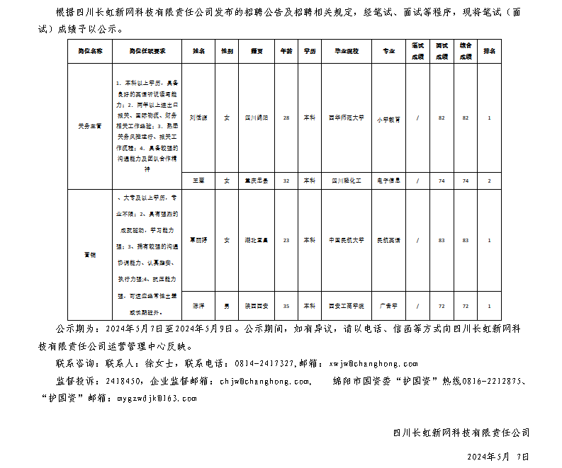 四川長(zhǎng)虹新網(wǎng)科技有限責(zé)任公司關(guān)于招聘關(guān)務(wù)等崗位測(cè)試成績(jī)的公示