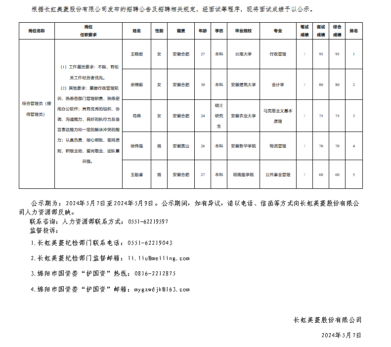 長(zhǎng)虹美菱股份有限公司關(guān)于招聘綜合管理員崗位測(cè)試成績(jī)的公示