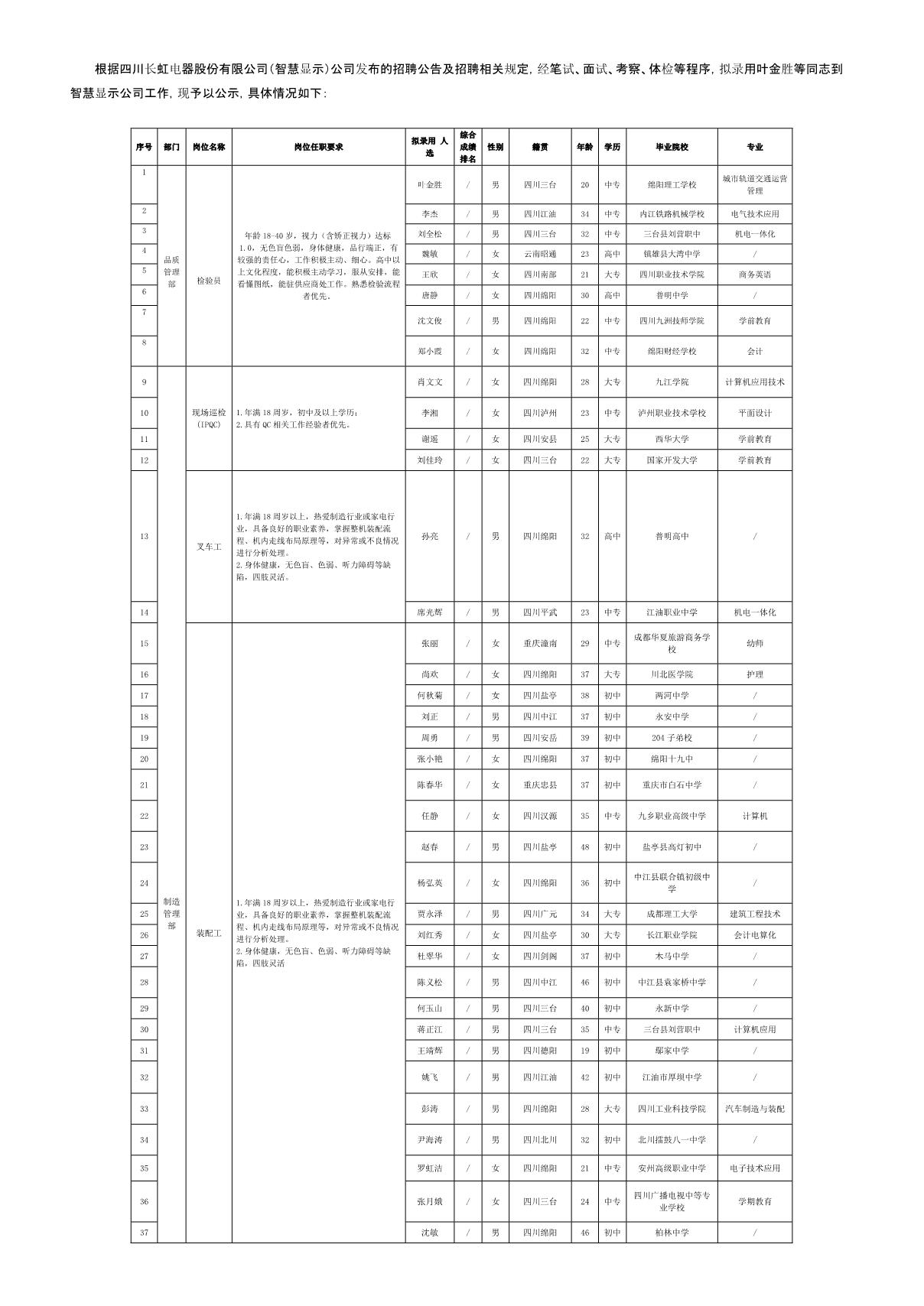 四川長虹電器股份有限公司(智慧顯示)關(guān)于招聘檢驗(yàn)員等崗位擬錄用人員的公示
