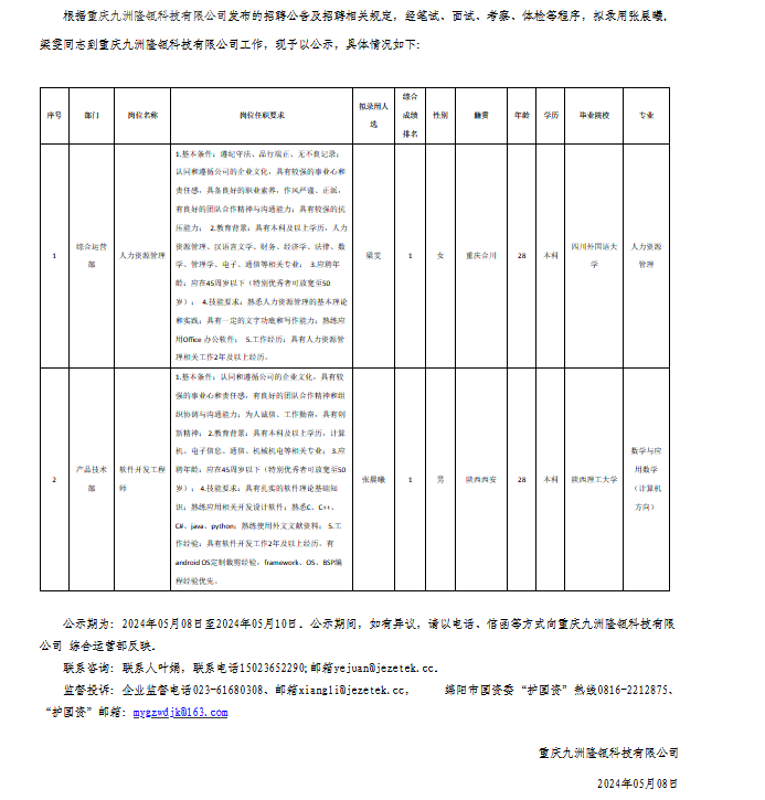 重慶九洲隆瓴科技有限公司關(guān)于招聘軟件開(kāi)發(fā)工程師等崗位擬錄用人員的公示