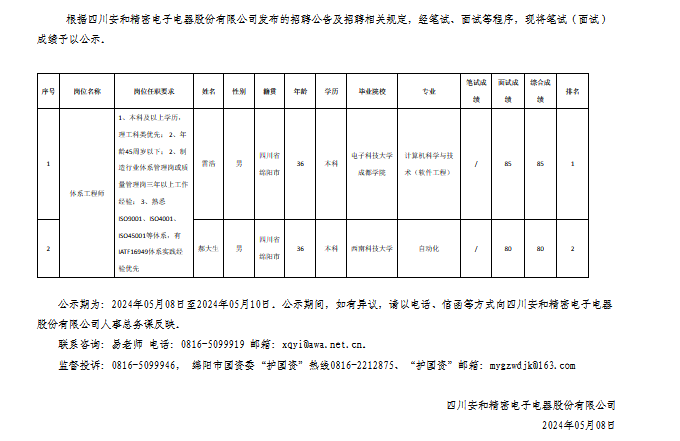四川安和精密電子電器股份有限公司關(guān)于招聘體系工程師測(cè)試成績(jī)的公示