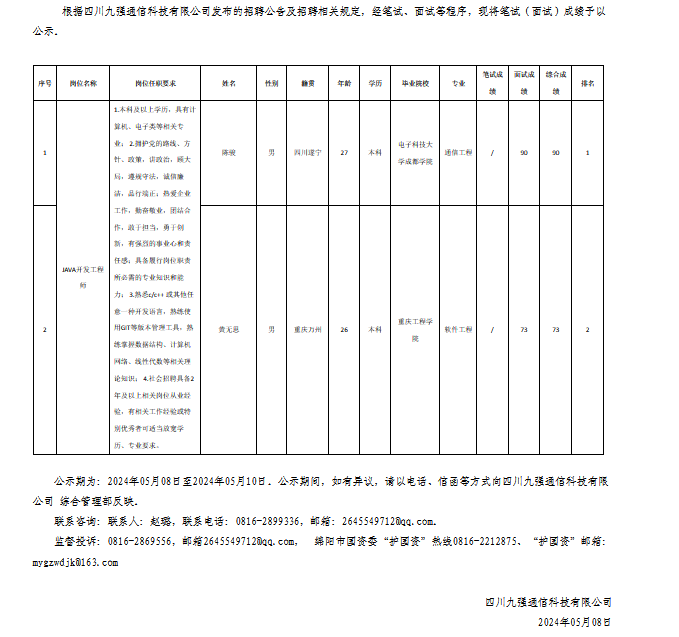 四川九強通信科技有限公司關(guān)于招聘JAVA開發(fā)工程師測試成績的公示