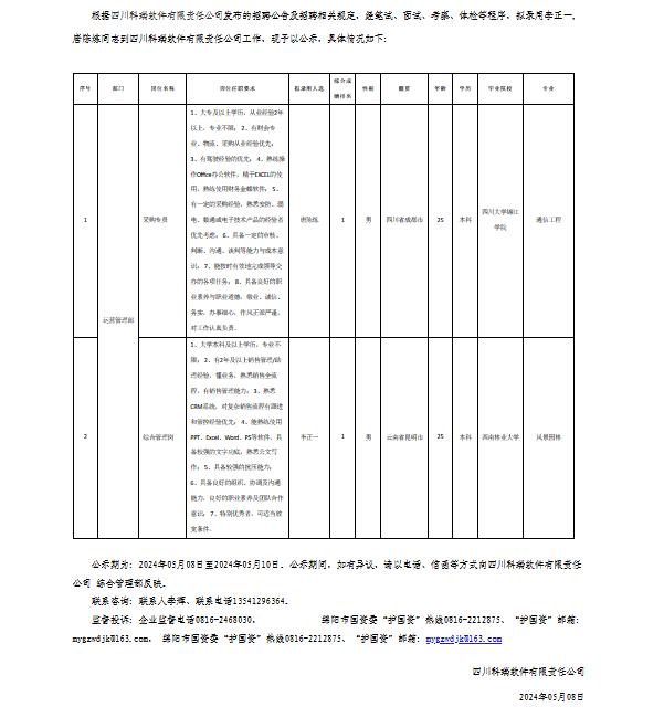 四川科瑞軟件有限責(zé)任公司關(guān)于招聘綜合管理崗等擬錄用人員的公示