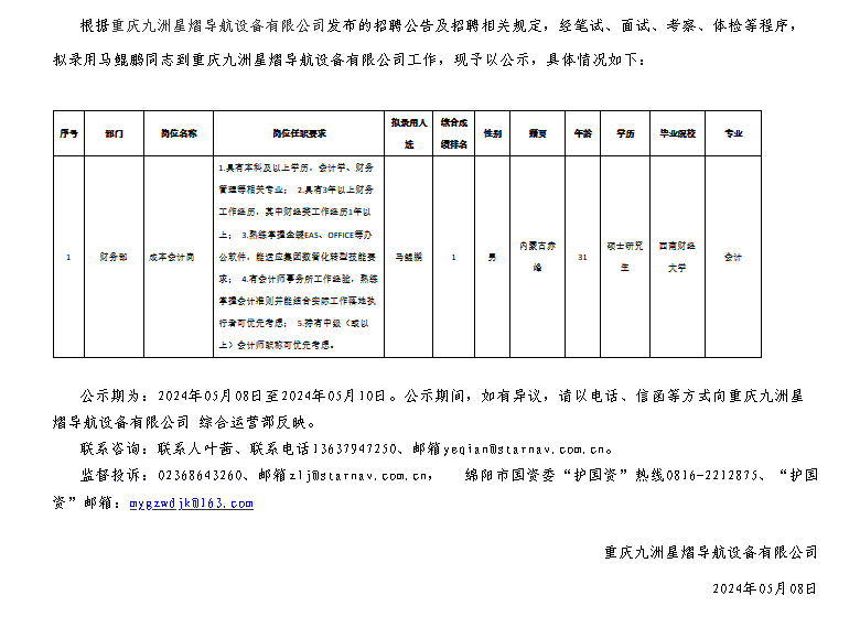 重慶九洲星熠導航設備有限公司關于招聘成本會計崗擬錄用人員的公示