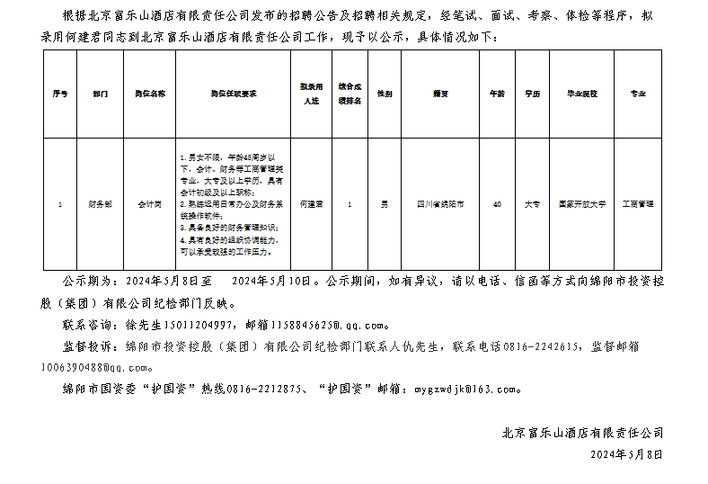 北京富樂山酒店有限責任公司關于招聘財務會計崗位擬錄用人員的公示