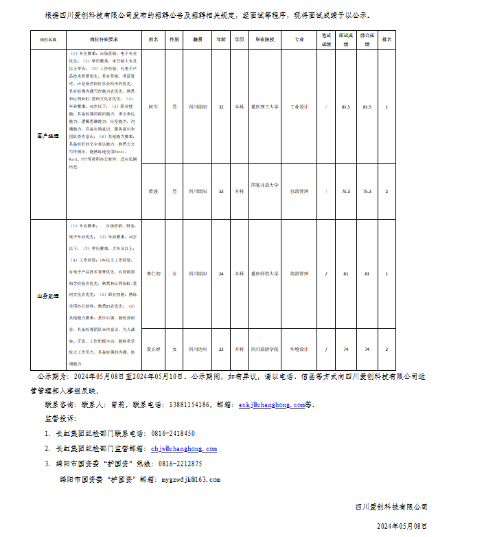 四川愛創(chuàng)科技有限公司關(guān)于招聘客戶經(jīng)理等崗位測試成績的公示