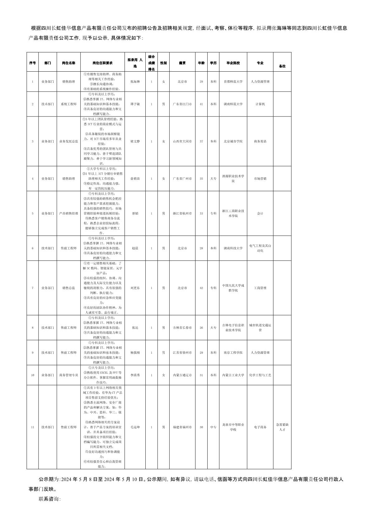 四川長虹佳華信息產(chǎn)品有限責(zé)任公司關(guān)于招聘系統(tǒng)工程師等崗位擬錄用人員的公示