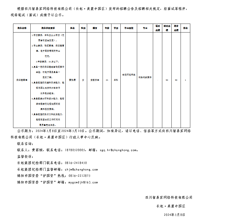 四川智易家網(wǎng)絡(luò)科技有限公司關(guān)于招聘供應(yīng)鏈管理崗位測試成績的公示