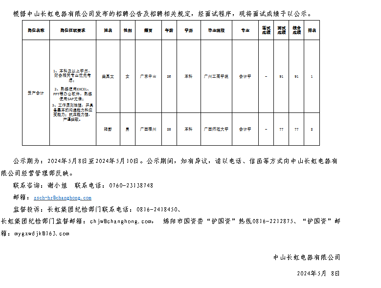 中山長虹電器有限公司關(guān)于招聘資產(chǎn)會計崗位測試成績的公示