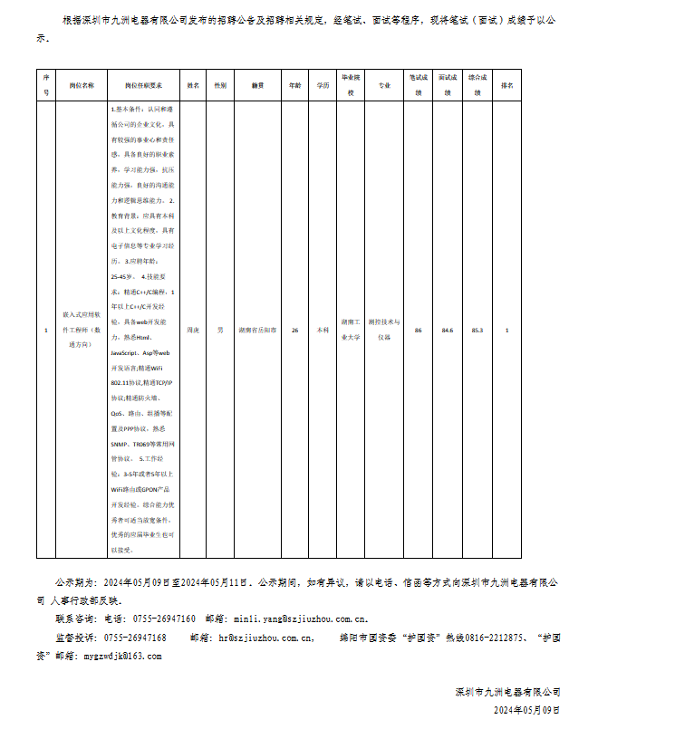 深圳市九洲電器有限公司關(guān)于招聘嵌入式應(yīng)用軟件工程師(數(shù)通方向)測試成績的公示