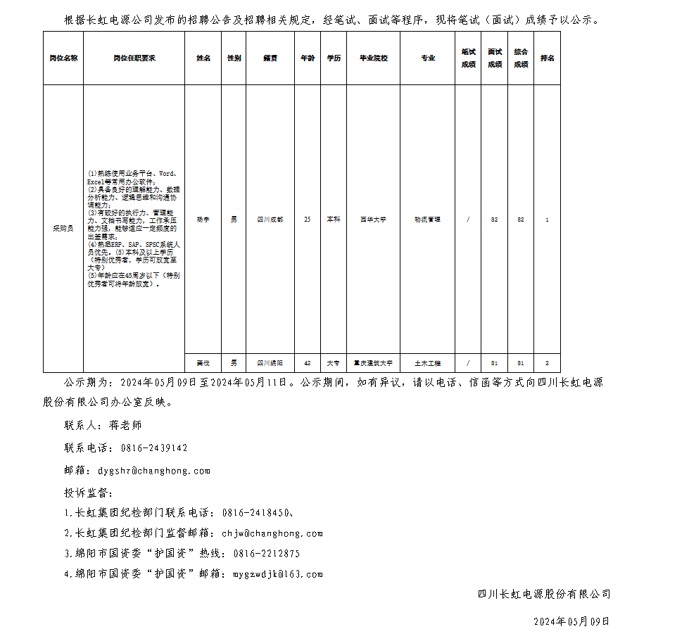 四川長虹電源股份有限公司關(guān)于招聘采購員崗位測試成績的公示