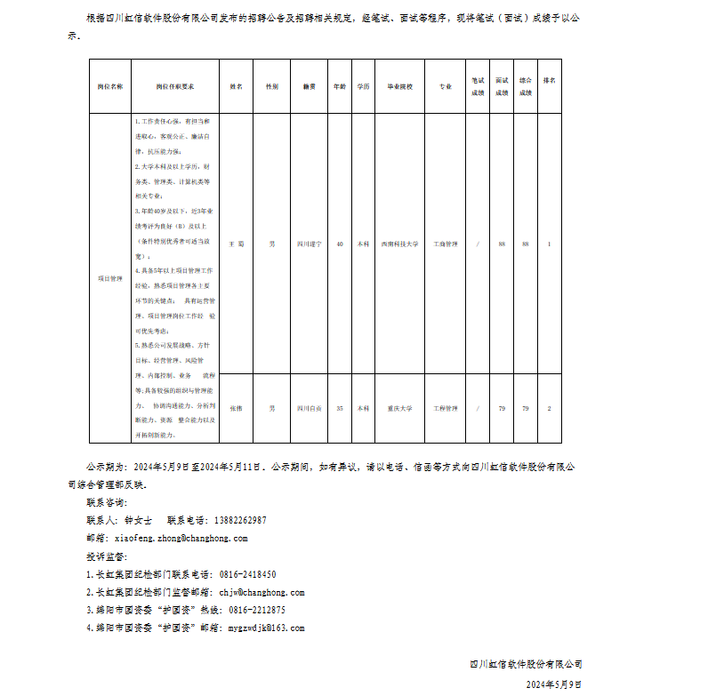 四川虹信軟件股份有限公司關(guān)于招聘項(xiàng)目管理崗位測試成績的公示
