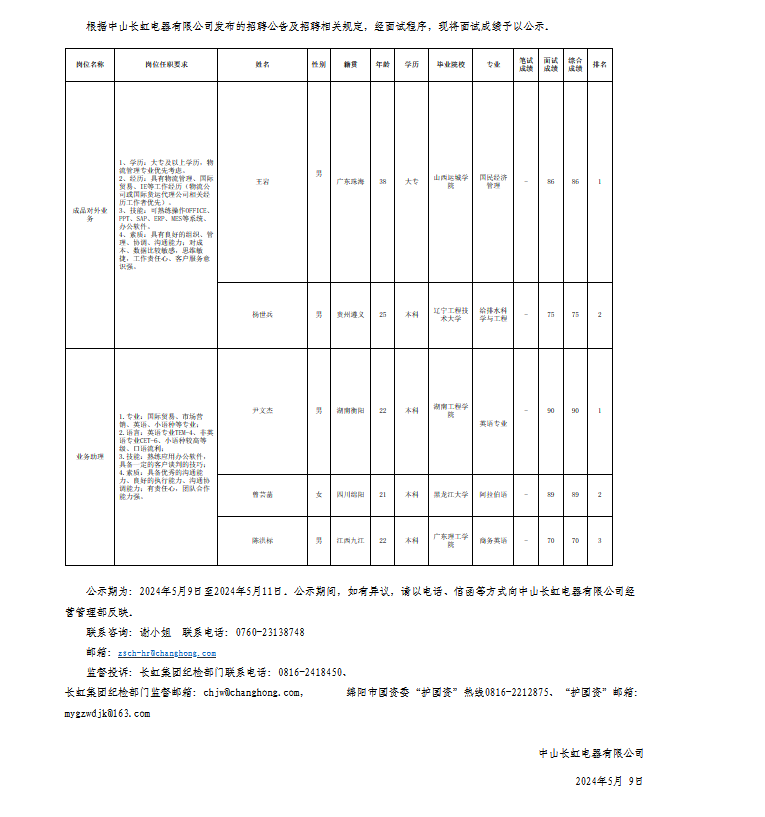 中山長虹電器有限公司關(guān)于招聘成品對外業(yè)務(wù)等崗位測試成績的公示