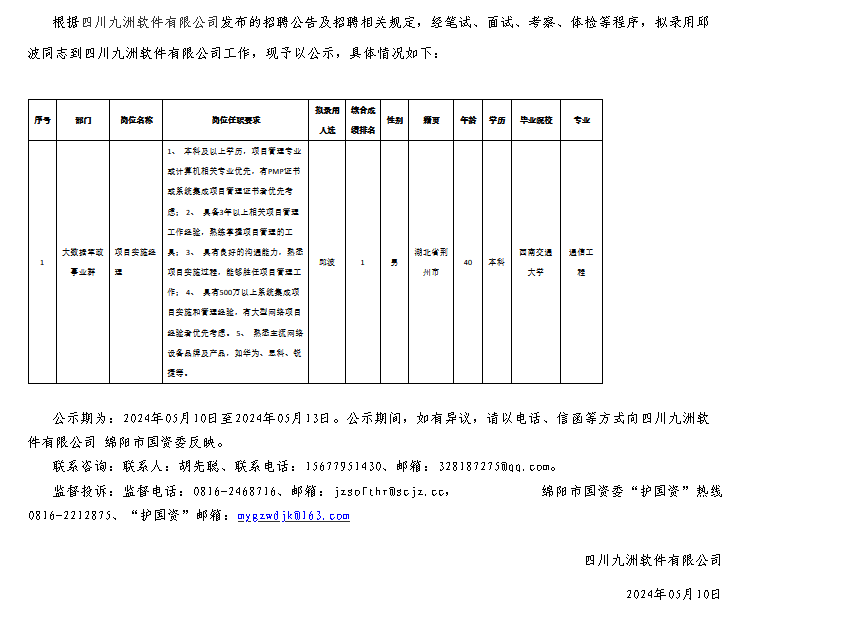 四川九洲軟件有限公司關(guān)于招聘項(xiàng)目實(shí)施經(jīng)理崗位擬錄用人員的公示