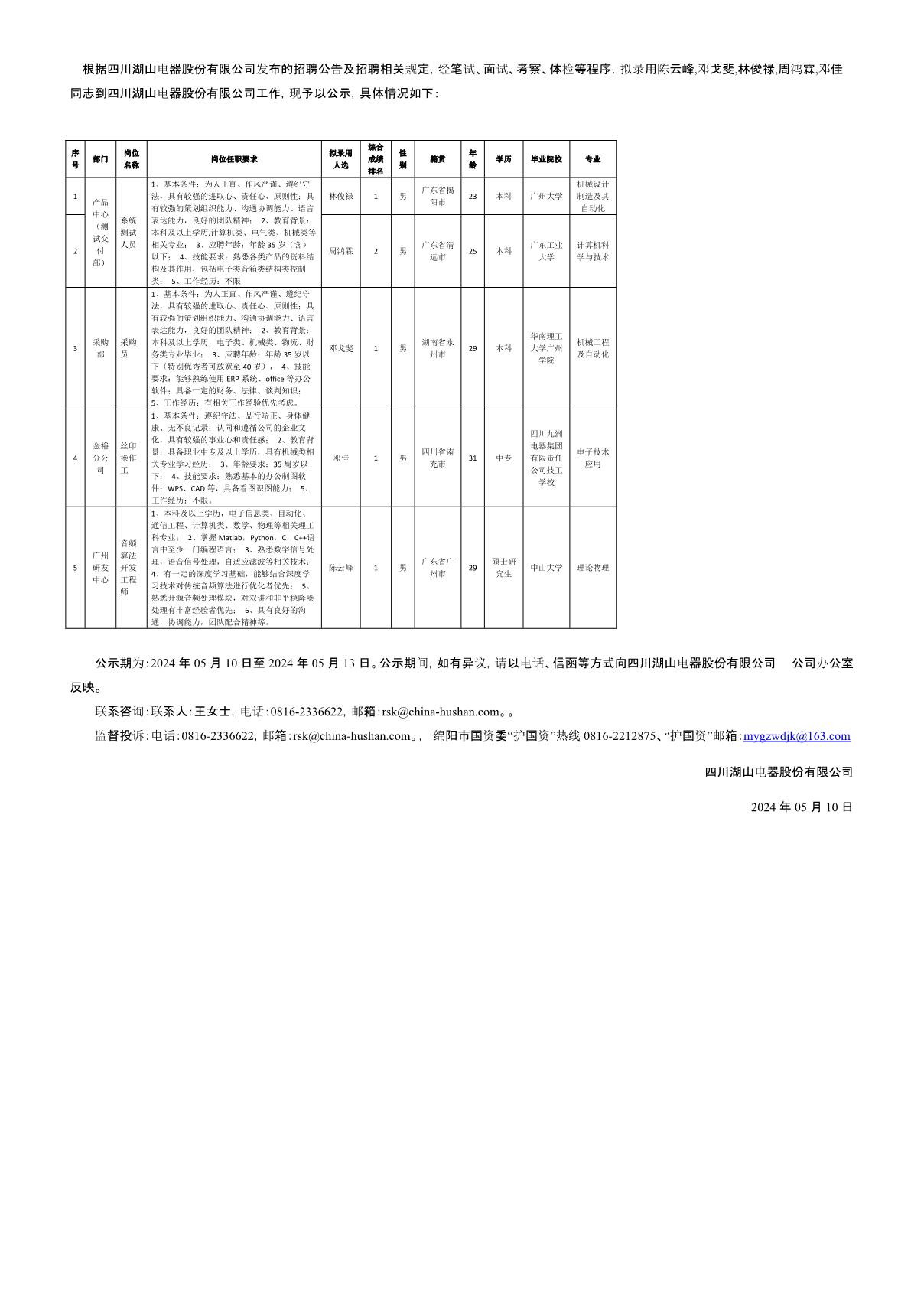 四川湖山電器股份有限公司關(guān)于招聘音頻算法開發(fā)工程師等崗位擬錄用人員的公示