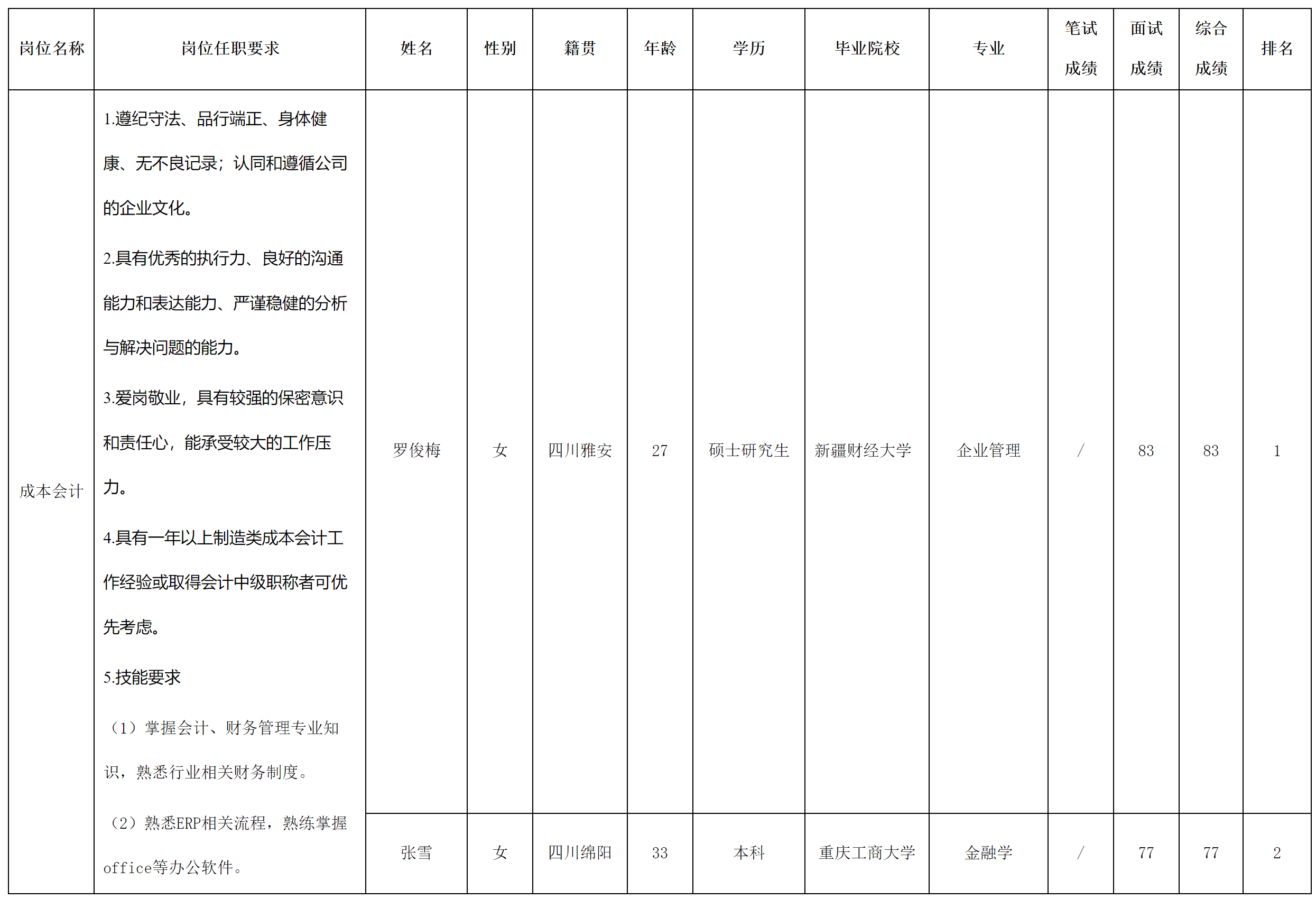 根據(jù)四川長(zhǎng)虹新能源科技股份有限公司發(fā)布的招聘公告及招聘相關(guān)規(guī)定,經(jīng)面試等程序,現(xiàn)將面試成績(jī)予以公示。