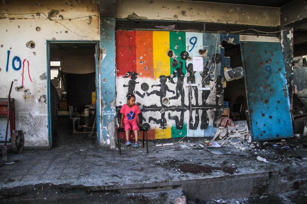 9月21日,在加沙地帶北部加沙城,一名女孩查看以軍襲擊后的廢墟。新華社發(fā)(馬哈茂德·扎基攝)