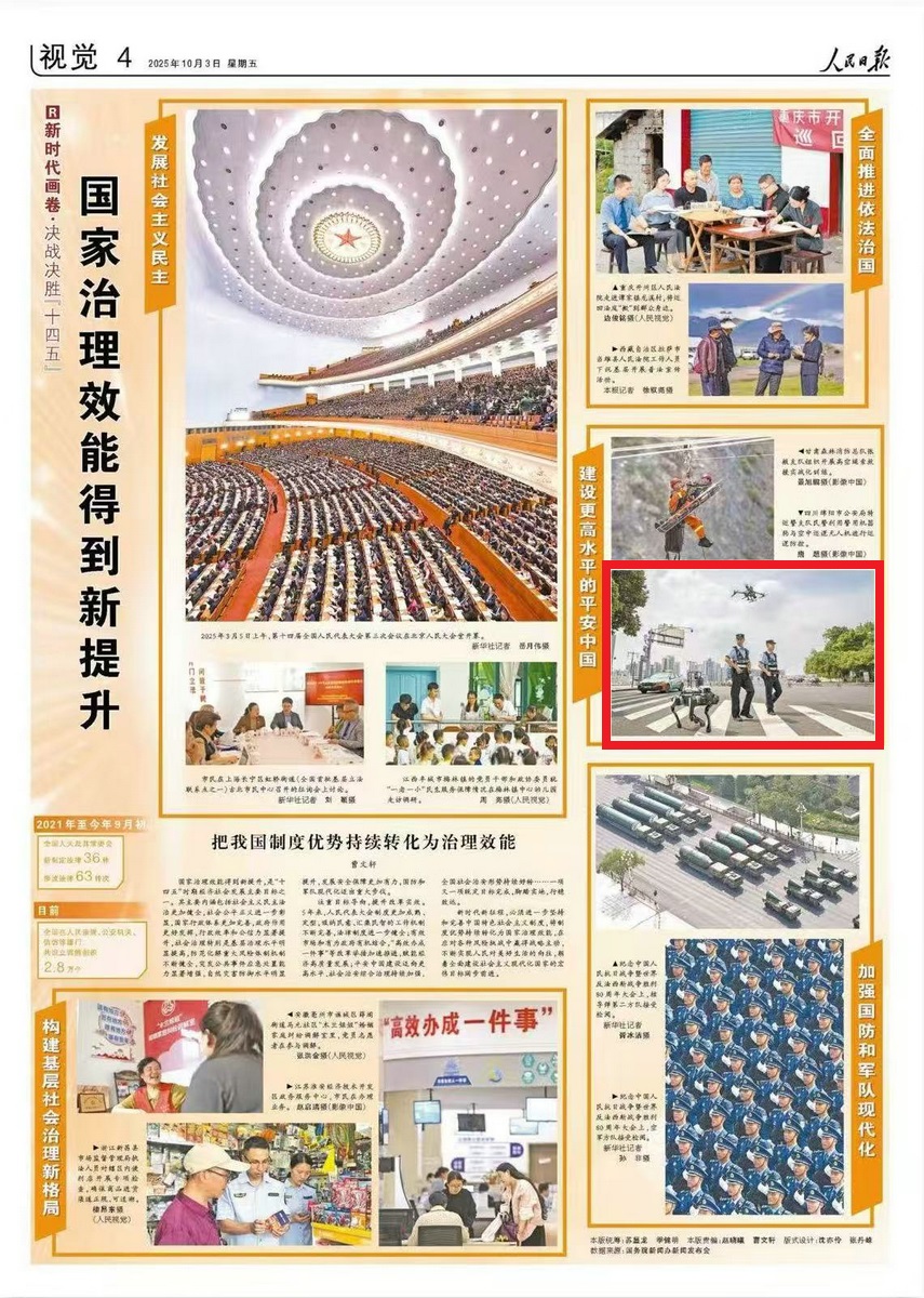 10月3日出版的《人民日?qǐng)?bào)》刊發(fā)文章《國(guó)家治理效能得到新提升》,以圖片形式展現(xiàn)“十四五”時(shí)期我國(guó)社會(huì)主義民主法治更加健全,“高效辦成一件事”等改革舉措加速推進(jìn),平安中國(guó)建設(shè)邁向更高水平。其中,關(guān)注了四川綿陽利用警用機(jī)器狗與空中巡邏無人機(jī)進(jìn)行巡邏防控,助力建設(shè)更高水平的平安中國(guó)。全文如下: