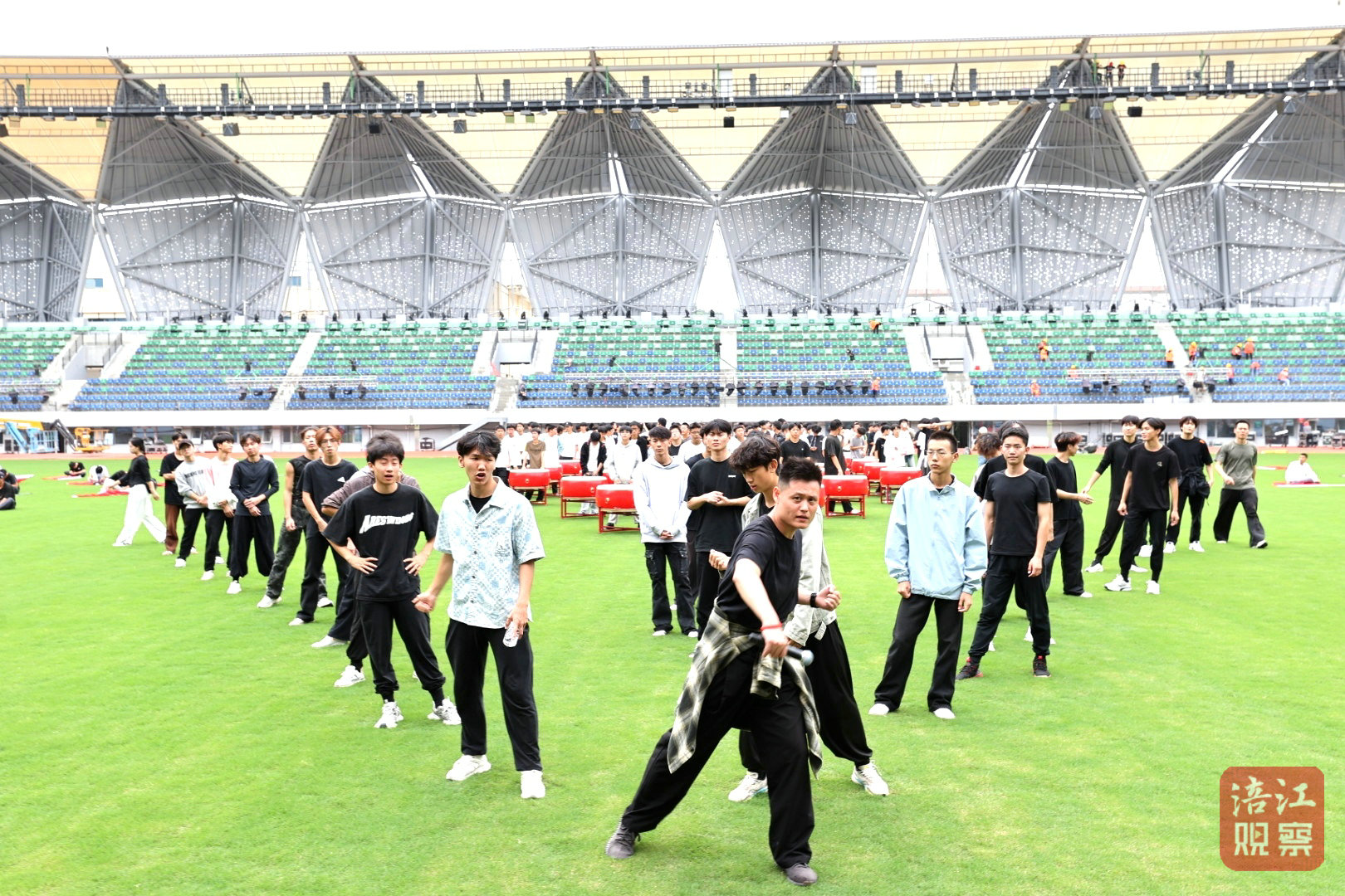 走進三臺體育場,嶄新的場館映入眼簾,場內(nèi)一片熱火朝天的景象:一邊是數(shù)百名演職人員緊張排練,另一邊則是由鼓手旗手表演方隊編導兼領舞陳天賜帶領的隊伍,他們正進行著最后的合練。