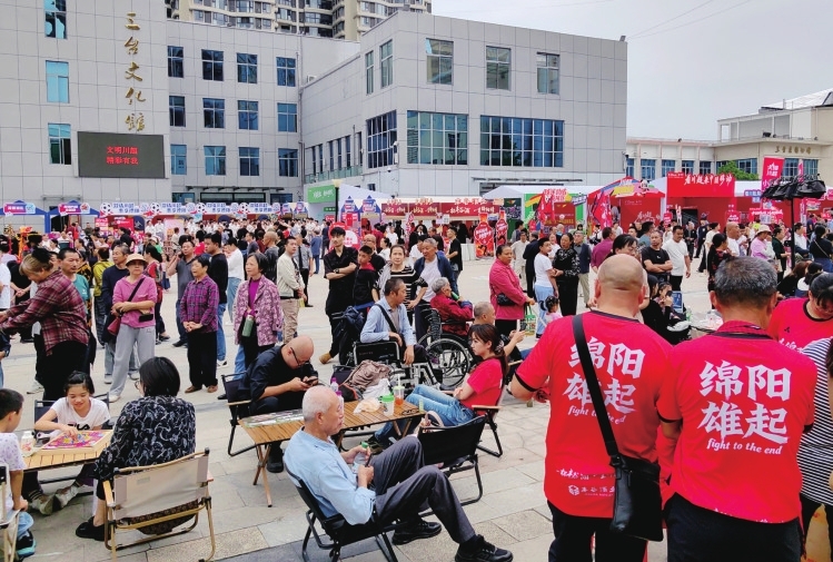 記者在現(xiàn)場看到,消費集市人流如織,江油肥腸、北川臘肉、梓潼片粉的香氣在空氣中交織,平武綠茶在沸水中舒展,安州安橙吸引食客駐足,富臨、凱瑞等房企展銷也人氣頗旺,為觀眾提供安居綿陽的置業(yè)選擇。同時,綿陽各縣(市、區(qū))特色啦啦隊輪番上陣表演,勁歌熱舞嗨動全場。