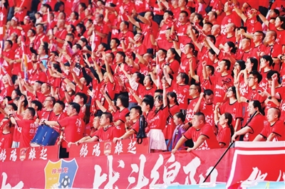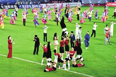 中場(chǎng)休息時(shí),綿陽與德陽兩地歌手聯(lián)袂帶來歌曲《超越夢(mèng)想》,四川籍實(shí)力唱將黃英領(lǐng)唱《我和我的祖國》,球迷紛紛加入合唱。